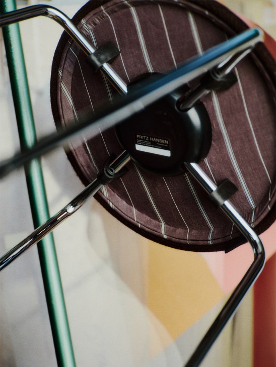 The collections include a series of Fritz Hansen’s Dot stools, designed in 1954 by Danish master Arne Jacobsen, upholstered using tweed production remnants from Another Aspect. Rich burgundy fabric is paired with a contrasting Japanese textile beneath the seat, made possible by the stool’s compact, dual-surface design, that lends itself neatly to repurposing small offcuts without compromising quality or expression.