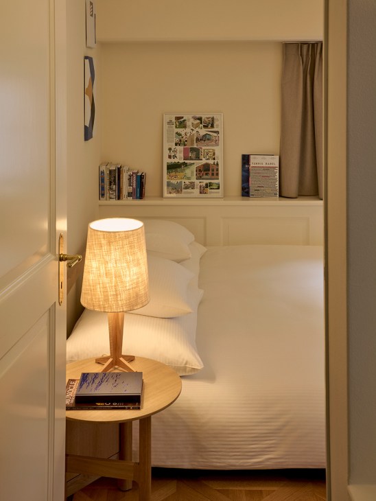 Inside, a series of photographic prints from Monocle’s archive adorn the walls, featuring original imagery from reportage in places such as Malta and Kyoto. German-made Technisat radios tuned to Monocle Radio also provide a point of connection with Monocle’s global network of correspondents, while wares from our favoured furniture houses including USM, Moebe, String, Seitz and Olaio add to the mix. Swiss-American furniture brand Seitz also created a custom table for the dining room, which is complemented by bespoke seating from Portugal’s Olaio, providing the perfect dinner setting for someone confident enough to whip up a meal in the apartment’s well-appointed kitchen. There are also a host of hand-picked pieces from Swiss galleries Studio Vintage and Sella Studio, which lend warmth, individuality and a sense of lived-in comfort.