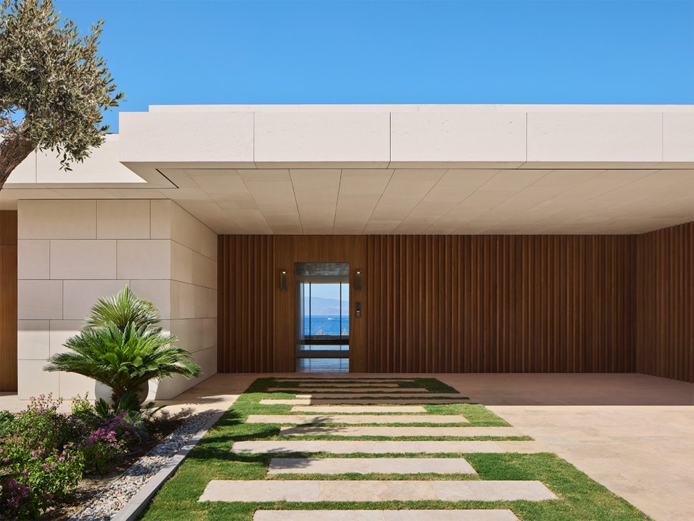 Inside, teak, brass and travertine provide a gentle material consistency. The sand-hued Denizli travertine used throughout the interiors is sourced from a local Turkish quarry and articulated in various finishes. Meanwhile, the open-plan layout and floor-to-ceiling windows blur the boundary between the outside and inside.