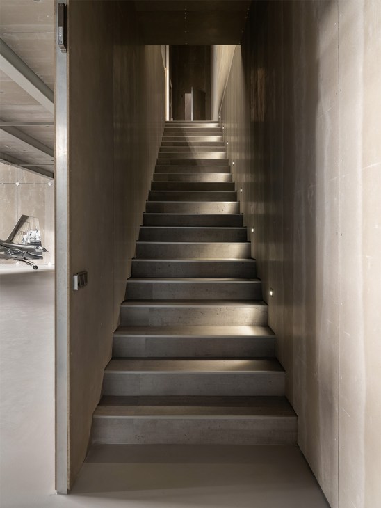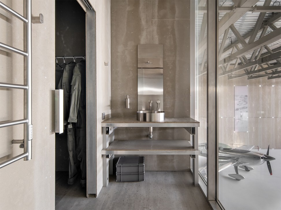 The structure’s defining exterior features are raw zinc doors that open to allow for light aircraft to taxi in and out of the hangar. Inside, the structure is fully exposed with steel trusses and technical air-duct engineering systems emphasising the functional nature of the building. That quality is enhanced by cement-bonded particle boards that clad the walls – a design choice that allows for easy repairs – and visible joints reference rivet-fasting techniques. Spot-accent lighting highlights sleek aluminium fuselages of the aircraft that it hosts.