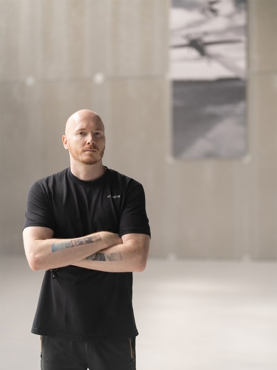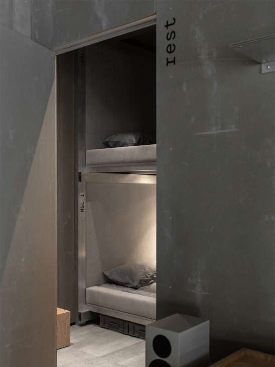 Built in a classified location in Ukraine, the structure serves as Aerotim’s base of operations – a meeting place for its pilots, drone operators, cameramen, skydivers and videographers. Split over two levels, the building combines repair and maintenance areas with storage and crew facilities. Despite the temptation to respond to the high-octane, high-risk nature of the work, the interiors are decidedly muted. “The overall design language is deliberately restrained,” says Vakhrameyev. “We relied on exposed surfaces, honest materials and precise detailing to create a mature, disciplined environment suited to pre- and post-flight routines.”