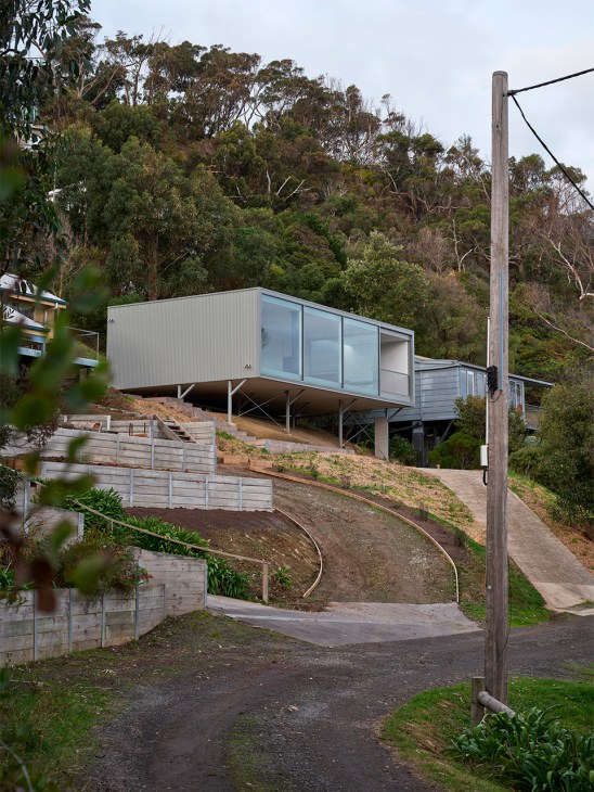 A similar approach can also be found in Goodman’s work on the Olive Street Cabin in the coastal town of Separation Creek. The project is a contemporary take on 1950s and 1960s Australian beach cabins, which populated the country’s coastlines following the Second World War. An iconic but increasingly rare form of architecture, such structures hold a place in the national consciousness: the skillion roofs, pared-back fibre-cement façades and simple floor plans represented the bare-boned nature of coastal life.