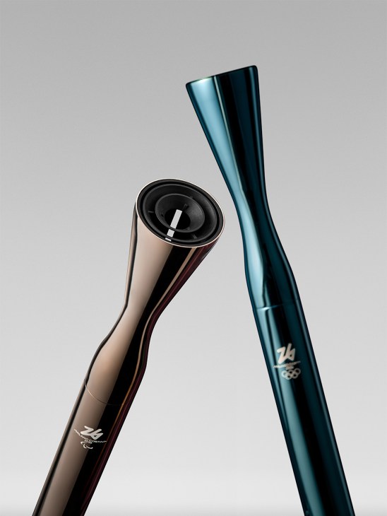 Unveiled last April, the torches were designed by Carlo Ratti Associati and the Cavagna Group. Carlo Ratti, a founding partner of the studio and director of MIT’s Senseable City Lab, said the design process for the torches was a collective affair, with many people working on the mechanics of the burners. An Olympics torch must be as durable as it is beautiful and one for the Winter Games must also be braced for inclement weather and altitude. Dubbed “Essential” for their streamlined appearance that emphasises the flame, the torches – one blue for the Olympics and the other gold for the Paralympics – are made from recycled aluminium and brass alloy that reflects light.