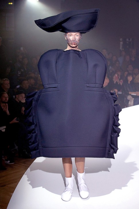 Westwood’s outlandishness, both in her designs and her appearance – she wore heavily layered looks and dyed her hair every colour of the rainbow – might not seem an obvious match with Kawakubo, best known for her all-black uniform and sleek bob haircut. But a closer look at their bodies of work reveals a spiritual synergy. “What’s interesting is that they’re both self-taught, which gave them a great sense of creative and artistic freedom in their approach to fashion,” says Danielle Whitfield, curator of the museum’s fashion and textiles department. “Their designs are about challenging the rules of dress as well as ideas about gender, beauty and the body.”