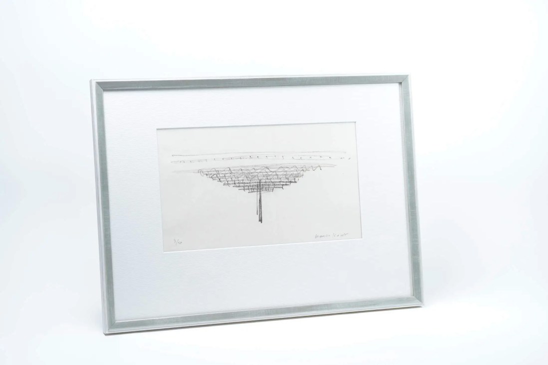 Ukiyo-e studio Takahashi Kobo has used traditional woodblock techniques to print the drawings of architect Kengo Kuma. This piece shows Kuma’s sketch for the Yusuhara Wooden Bridge Museum.