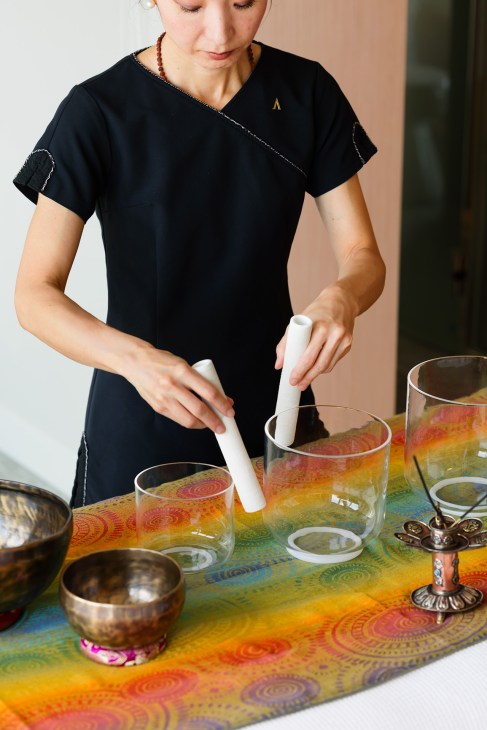 Perched on the 38th floor of Conrad Osaka, Conrad Spa exudes serene sophistication. Natural materials are bathed in a gentle glow, while the spa’s signature scent, Serenity, enhances the calming ambiance. This exclusive retreat offers personalised massages, facials and body treatments, including Healing Harmony, reserved for hotel guests. “It’s important that we take time to focus on ourselves from the inside out,” says senior therapist, Mari Matsumoto. Following a brief consultation, the private experience unfolds with a blend of Reiki healing and sound therapy using Tibetan singing bowls. “Sound healing removes negative feelings, clearing the way to bring in new energy,” adds Matsumoto. Designed to work in harmony, these techniques relax, release stress and restore balance.
