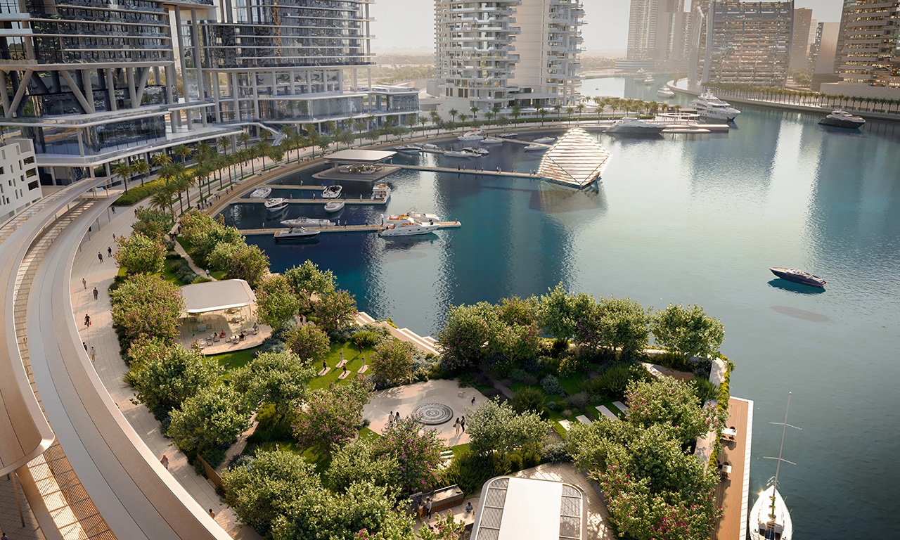 The anchor is The Lana, Dorchester Collection, Dubai, a pair of connected towers designed by Foster + Partners with interiors by Gilles & Boissier. One tower houses a hotel, with Dior Spa, rooftop pool and fine-dining restaurants, while the other is home to 39 private residences. Residents can dock yachts along the promenade and step directly into the hotel lobby.