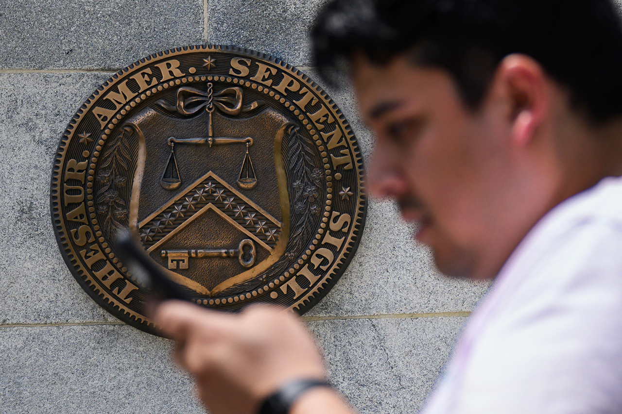 A pedestrian passes by the seal of the US Treasury Department in Washington, DC, on May 8, 2023. - Treasury Secretary Janet Yellen said Monday that there is a "big gap" between the positions of US President Joe Biden and Republican leaders when it comes to a decision on raising the debt limit. (Photo by Mandel NGAN / AFP) (Photo by MANDEL NGAN/AFP via Getty Images)