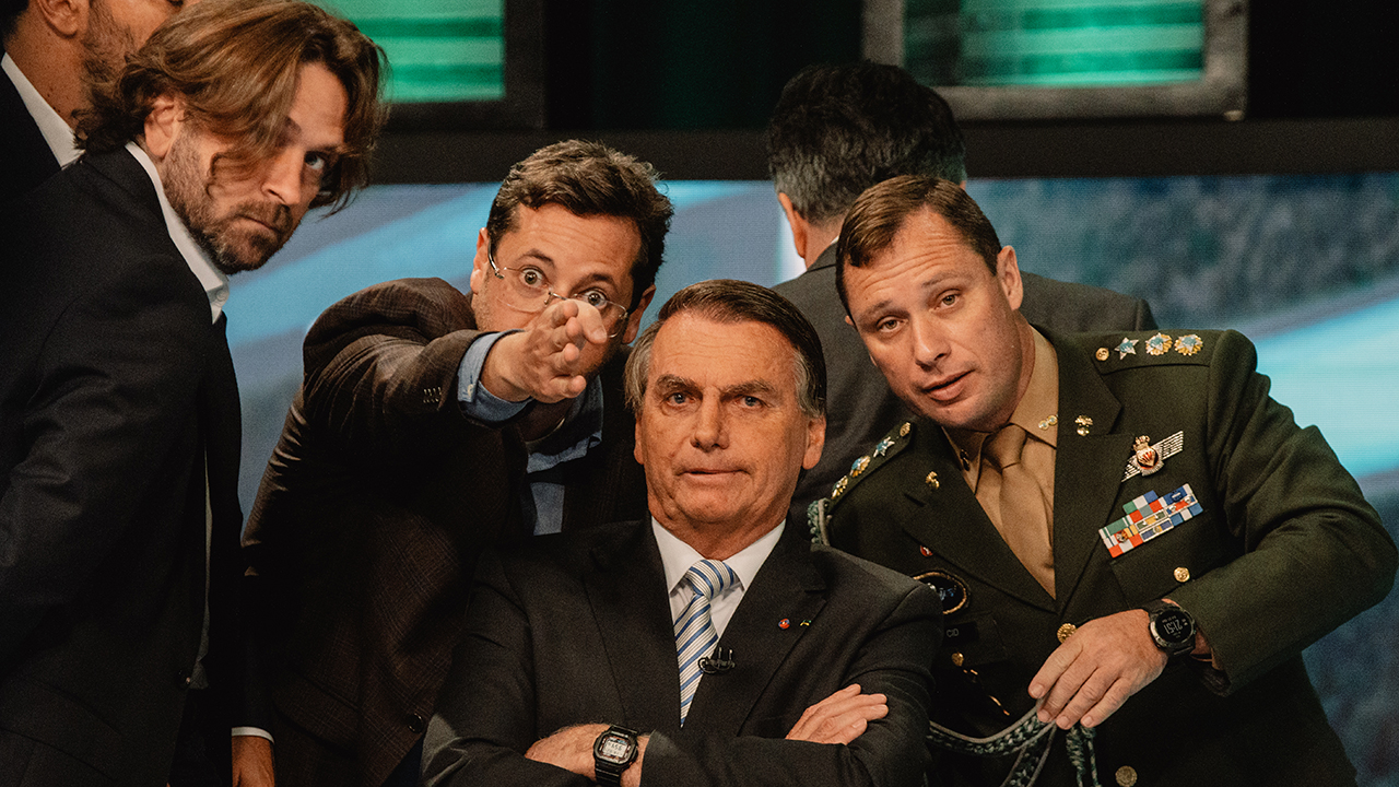 Le président Jair Bolsonaro, candidat à sa réélection, pendant l'interview diffusée en direct au siège de la chaîne de télévision SBT à Sao Paulo, au Brésil.