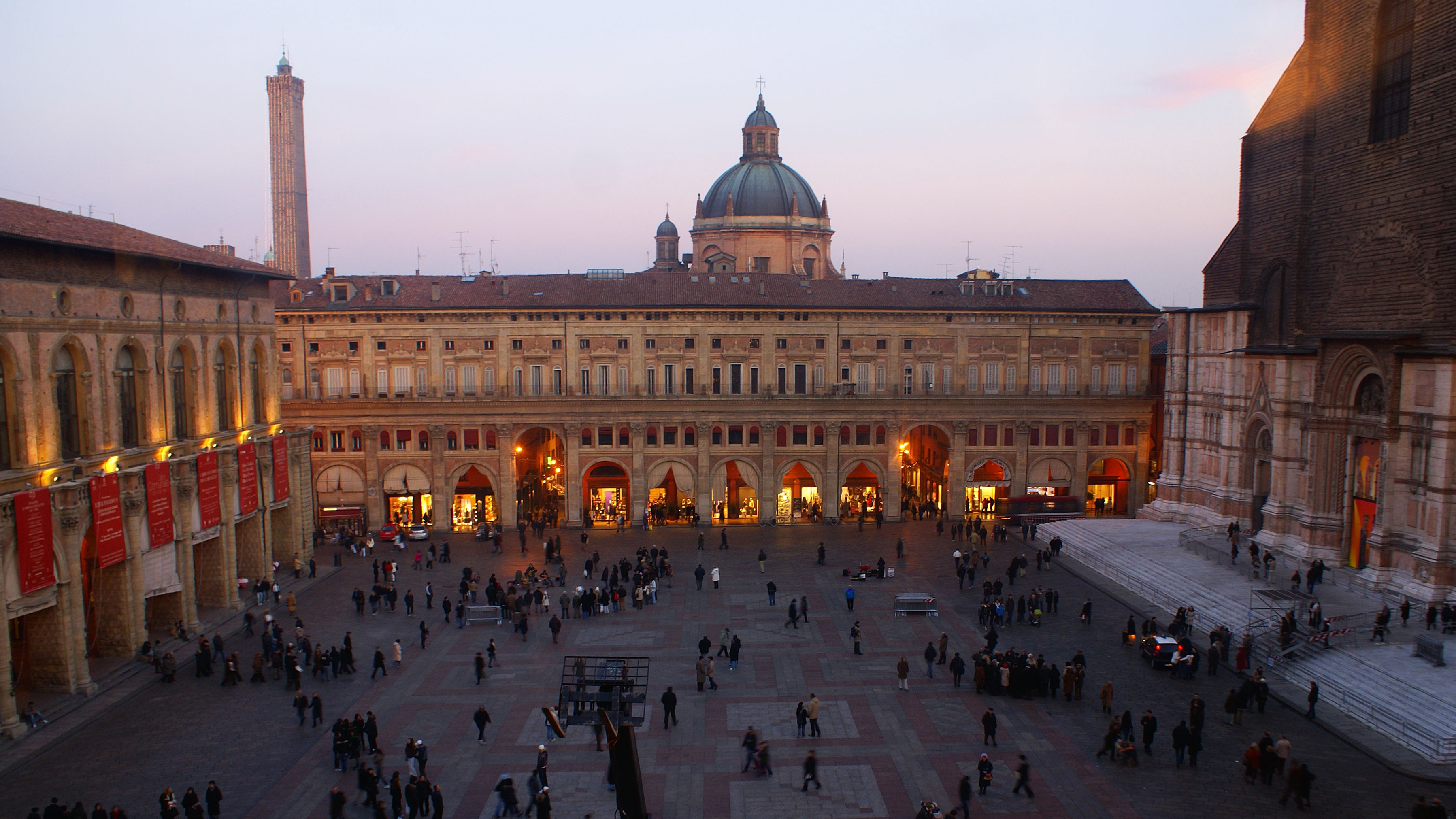 We take an evening stroll around Bologna and enjoy some of the city’s beautiful outdoor public spaces, from the central square, the Piazza Maggiore, to walkways sheltered by medieval porticoes.